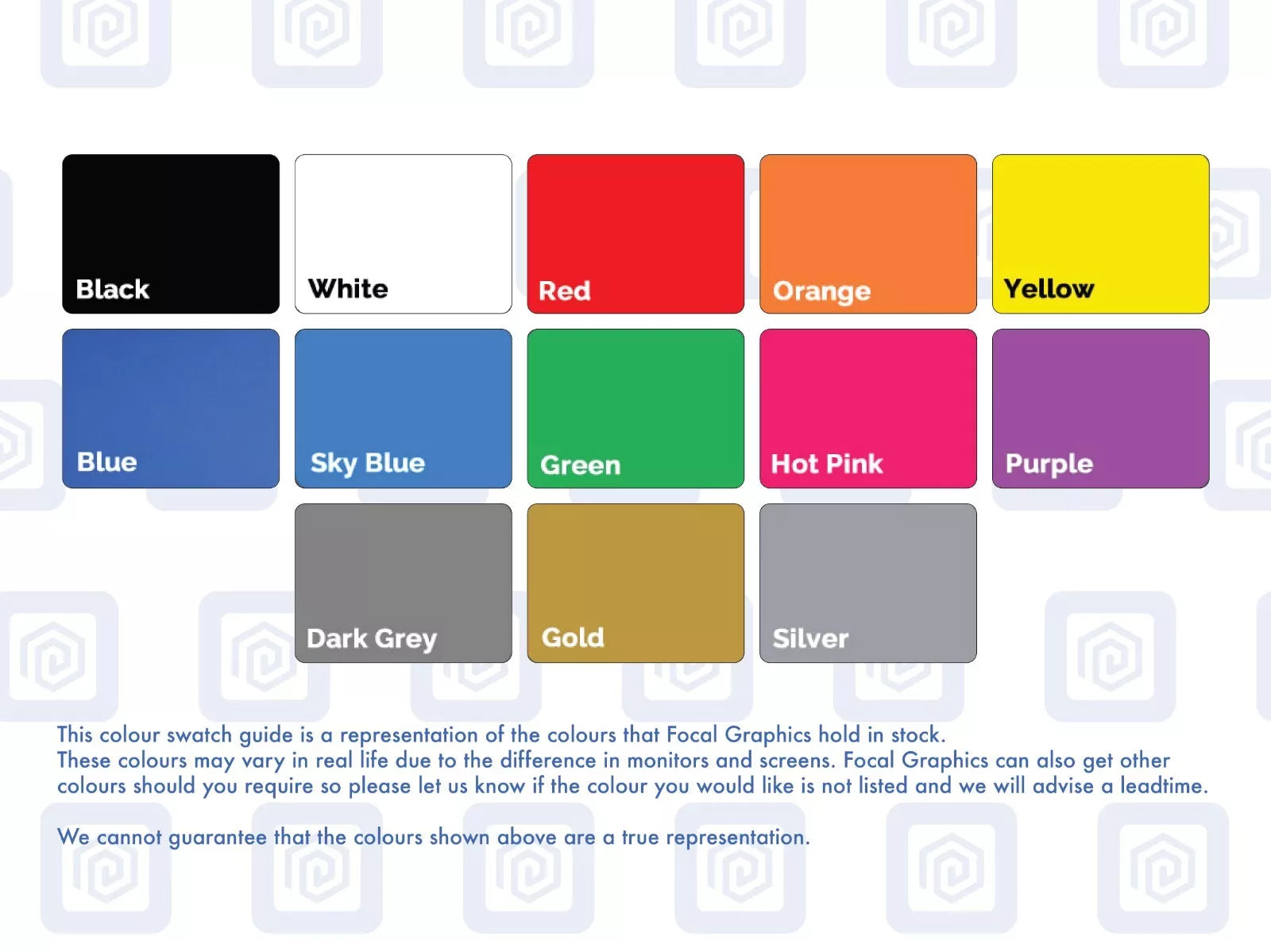 Gloss Black, Matt Black, White, Orange, Red, Dark Blue, Light Blue, Yellow, Green, Purple, Pink, Grey, Silver, Gold