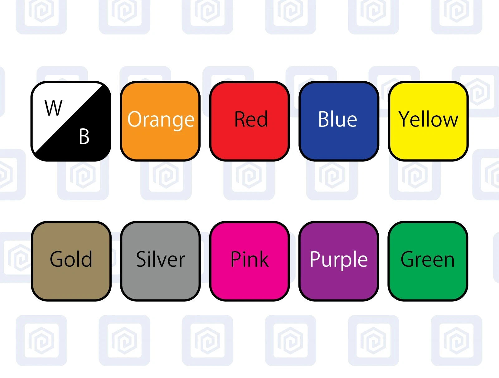 Black, White, Orange, Red, Blue, Yellow, Green, Purple, Pink, Silver & Gold